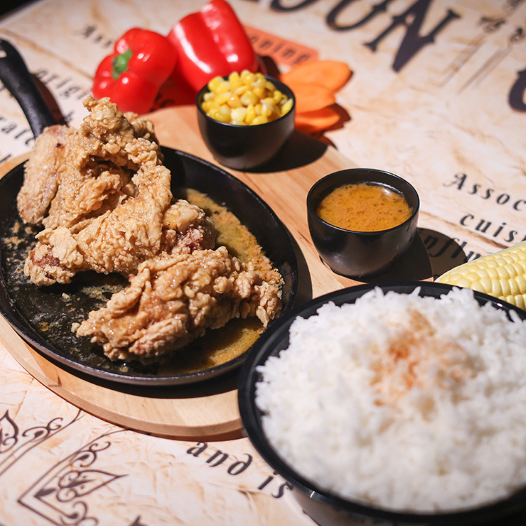 sizzling fried chicken boonless breast served with rice & buttered corn kernels